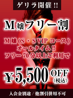 ■М嬢フリー割■ 本日!なんとっ!! ¥5、500off!!! ◆М嬢(S・SVIPコース) フリー70分以上 ※入会金別途他割引併用不可 人気嬢多数出勤! |
